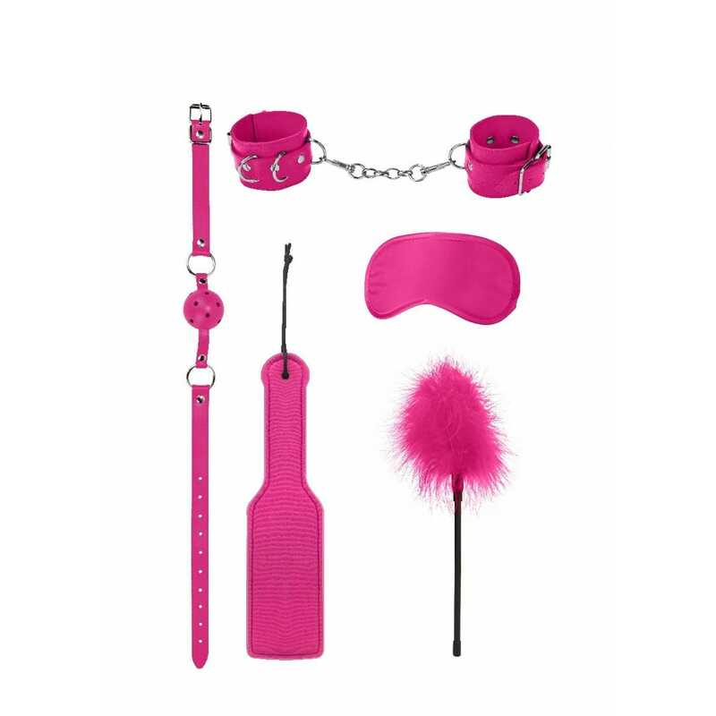 Набор БДСМ-девайсов розовый "Ouch" кляп, наручники, шлепалка, маска, ласкалка